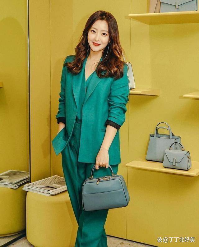 金喜善官方身高是168cm,在女生里算个高的了,这件绿西装穿在她身上长度刚好遮住臀部。此种衣长娇小女生也可一试,想露出小翘臀的话,则选择短款。由于西装是敞开穿的,所以可看到内搭。其颜色依旧为绿色,很有可能是件马甲。其领子设计简约大气,衣摆直接塞进了裤腰,这样的话,使得双腿看上去更长。